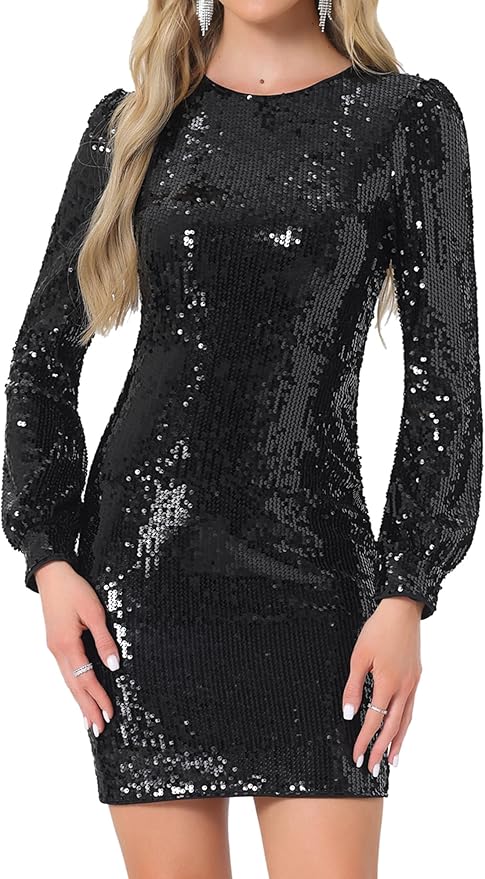 - This sparkly dress for women is made up of several design points: crew neck, long lantern sleeve, back zipper, sequin fabric, mini length, bodycon design