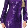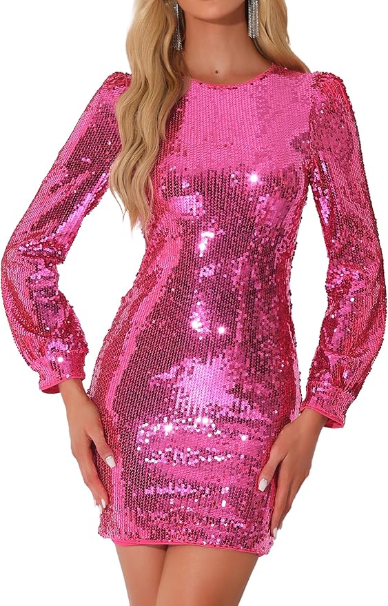 - This sparkly dress for women is made up of several design points: crew neck, long lantern sleeve, back zipper, sequin fabric, mini length, bodycon design